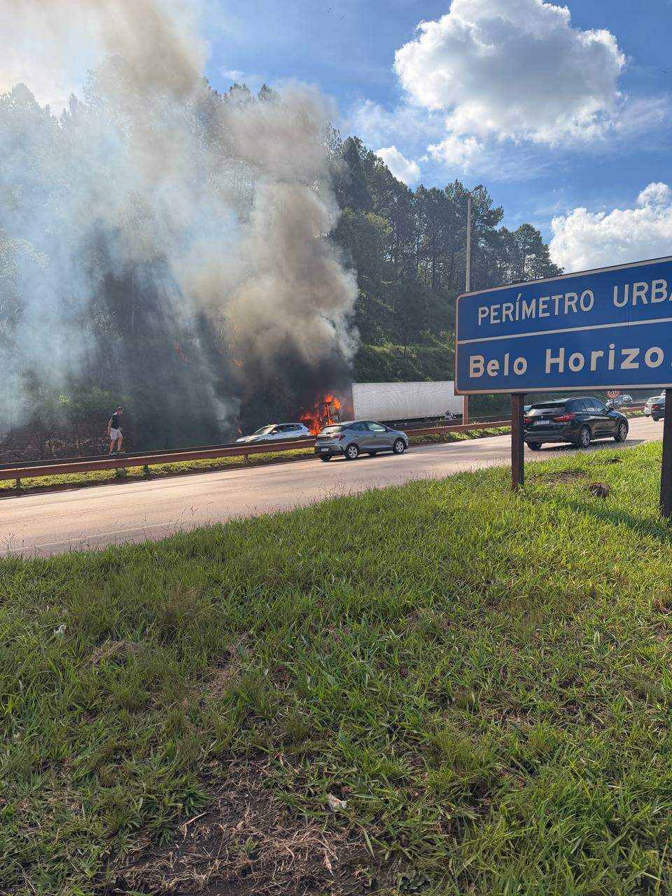 Incêndio em caminhão na BR-040 mobiliza bombeiros em Nova Lima