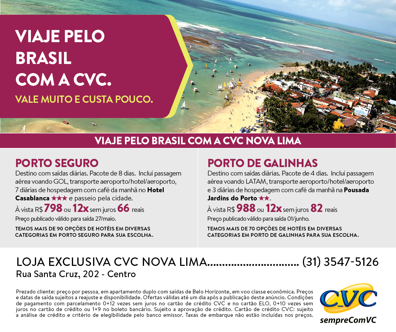 A CVC Nova Lima está com várias promoções para maio: além de Porto Seguro e Porto de Galinhas, a loja também oferece bons preços para Buenos Aires e Cancun. Veja abaixo condições. Tem dúvidas? Ligue: 3547-5126