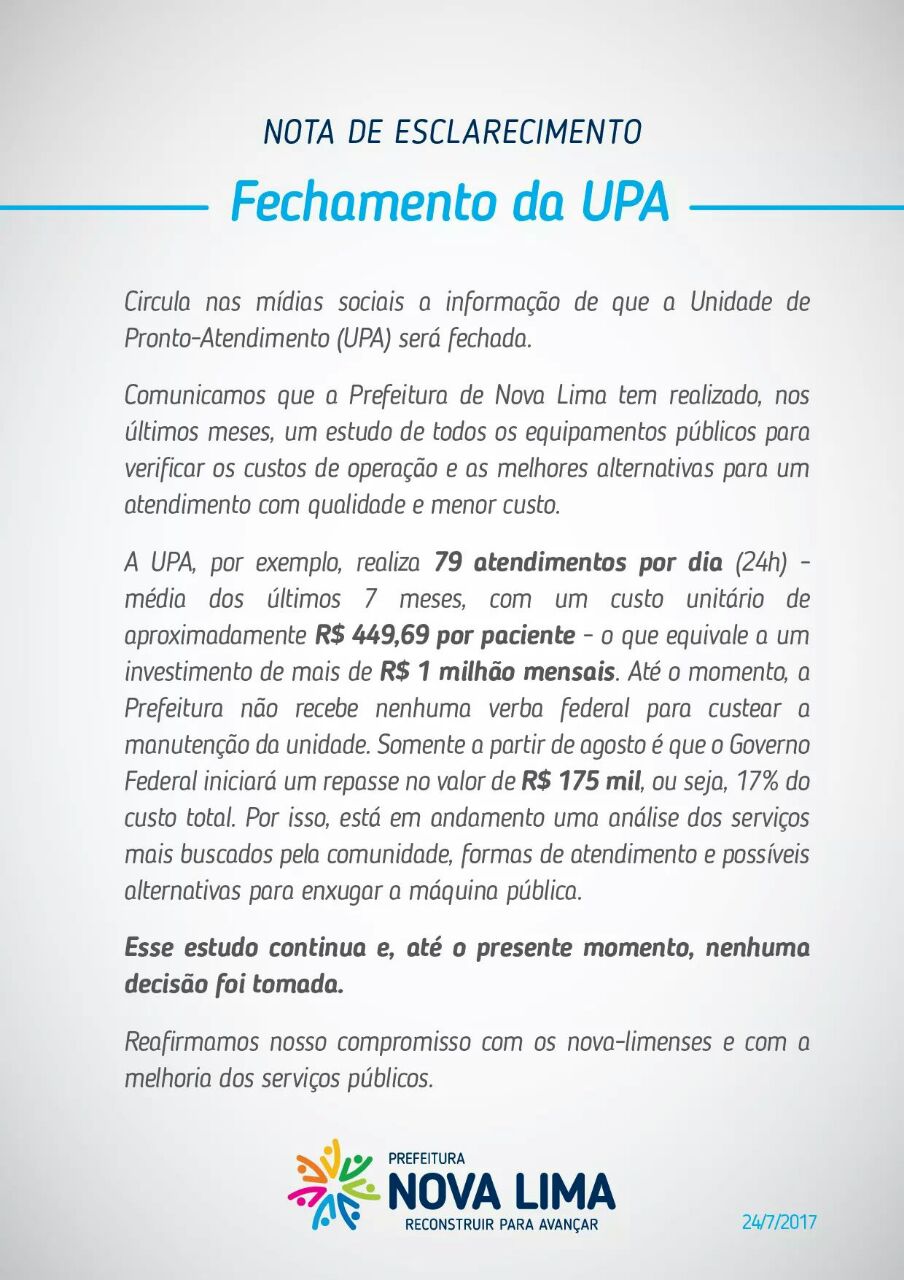 A Prefeitura Municipal de Nova Lima emitiu nota após o Sempre Nova Lima divulgar informações de que a UPA poderia ser fechada para reduzir custos fixos (Leia Aqui). Apesar de não confirmar fontes do governo sobre o fechamento da unidade, a Assessoria de Comunicação através da Secretaria de Comunicação confirmou que busca formas de manter os serviços e aprimorar os gastos.