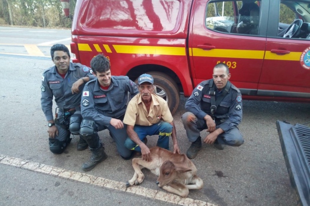O Corpo de Bombeiros salvou uma bezerra de apenas dois dias em Nova Lima, na RMBH. O animal estava com o proprietário em uma área que pertence à Vale, onde ele tem autorização para fazer o pasto.