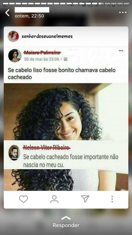 Em outro post, compartilhado pelo Facebook de terceiros, o estudante postou uma foto no status do Whatsapp, onde aparece uma mulher de cabelo cacheado com os dizeres: “Se cabelo liso fosse bonito chamava cabelo cacheado”; “Se cabelo cacheado fosse importante não nascia no meu cu (sic)”.