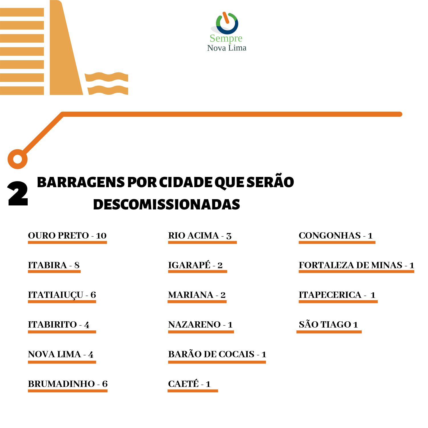 Ouro Preto, no entanto, é a cidade que tem mais barragens que vão ser descomissionadas. São pelo menos dez, segundo o Governo do Estado de Minas Gerais. Itabira vem na segunda colocação com oito; Itatiaiuçu com seis; Itabirito e Nova Lima possuem quatro; Brumadinho e Rio Acima, três; Igarapé, Mariana e Nazareno, duas. Veja o restante: