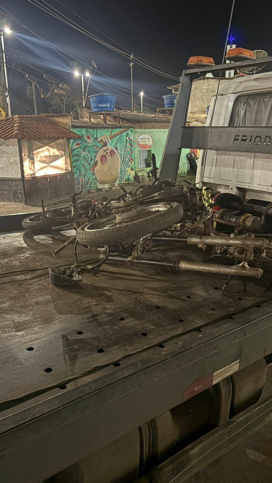 A PM se deslocou até o local, onde pessoas não identificadas fugiram para uma área de mata nos fundos do condomínio. No entanto, os policiais encontraram dois chassis com numeração raspada e totalmente descaracterizados. Um reboque credenciado foi acionado para remoção e o jovem foi encaminhado à delegacia.