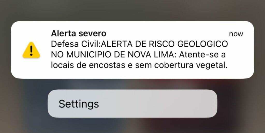 SEMPRE NOVA LIMA – A Defesa Civil emitiu, na tarde desta terça-feira, dia 16, um alerta severo de risco geológico para o município de Nova Lima. O aviso foi enviado para celulares de diversos moradores da cidade.
