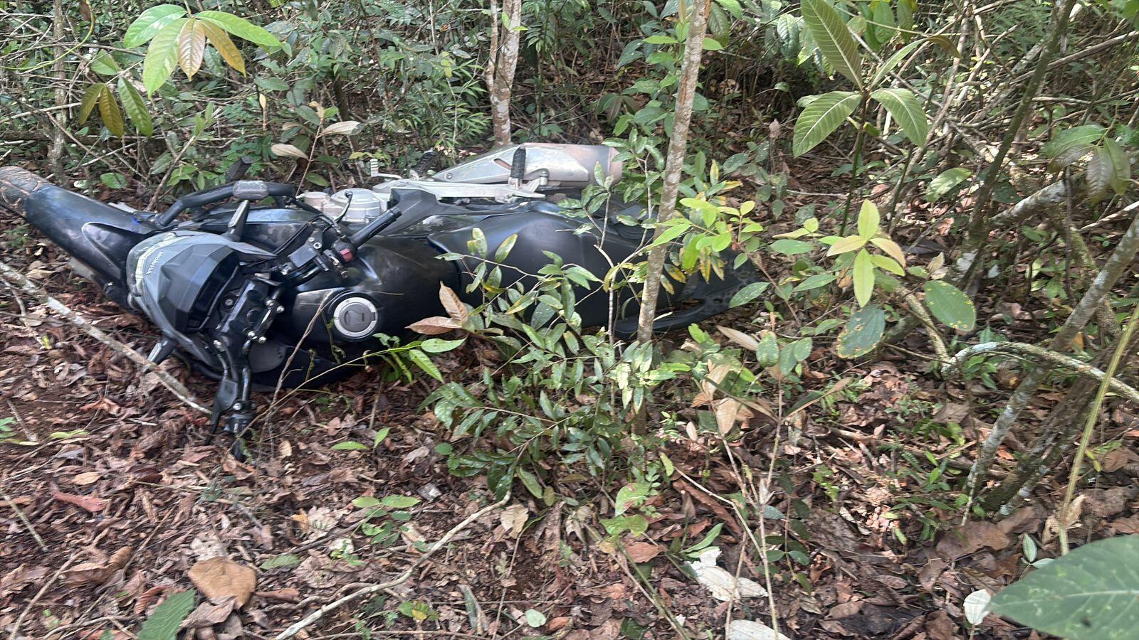 Diante das informações, os agentes seguiram até o local indicado e realizaram buscas na área. A motocicleta foi encontrada caída em um barranco e identificada como uma CB 250F Twister, de cor preta.