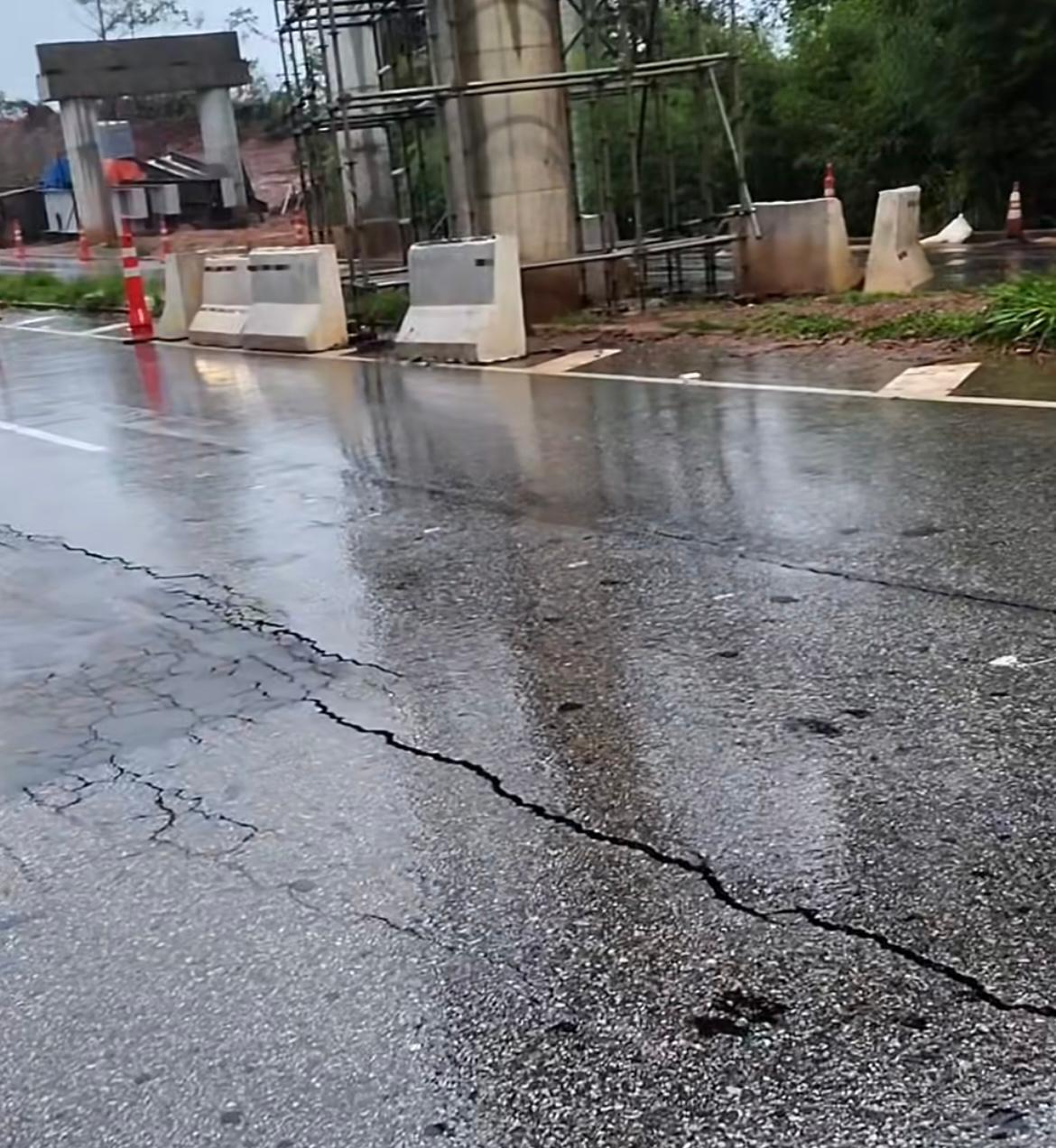 JORNAL SEMPRE – Um trecho da MG-30, em Nova Lima, próximo ao condomínio Ville de Montagne, apresenta registros de trincas no asfalto e uma outra fissura próxima a uma coluna, em área onde há obras em andamento.