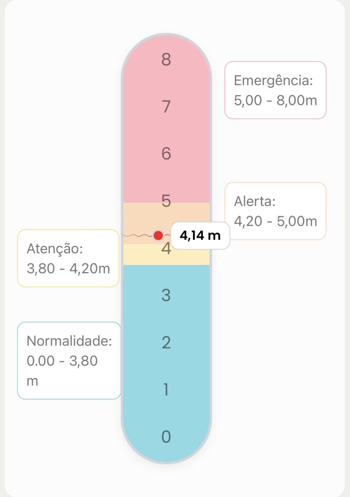 O sistema de monitoramento apresenta quatro níveis de classificação. A faixa de normalidade vai de 0,00 a 3,80 metros. O nível de atenção compreende medidas entre 3,80 e 4,20 metros. O estado de alerta é caracterizado quando o rio atinge entre 4,20 e 5,00 metros. Já a situação de emergência ocorre quando o nível varia de 5,00 a 8,00 metros.