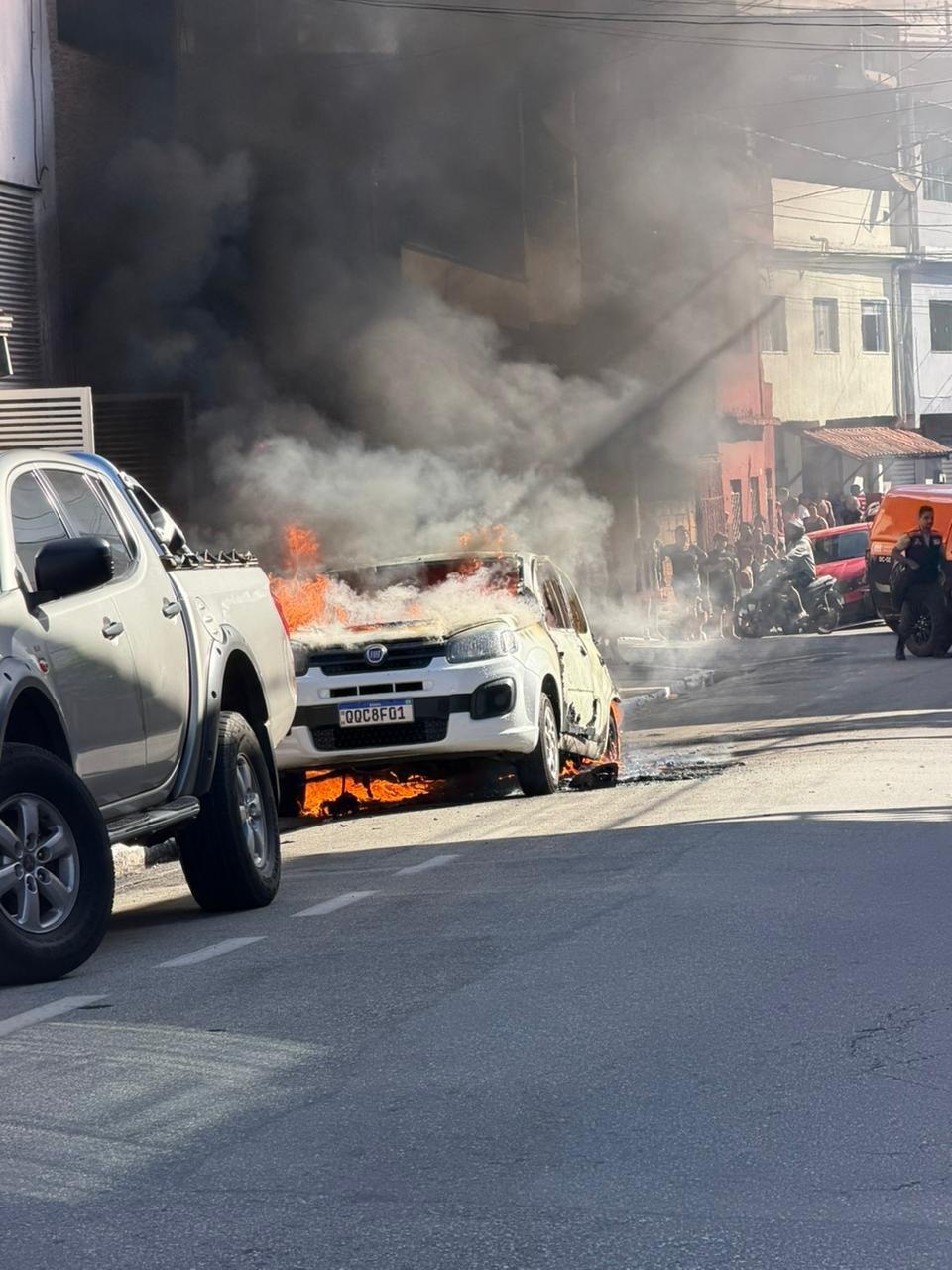 O Corpo de Bombeiros foi acionado e atua no local. Havia risco de propagação das chamas para uma residência situada logo em frente ao ponto onde o carro incendiava.