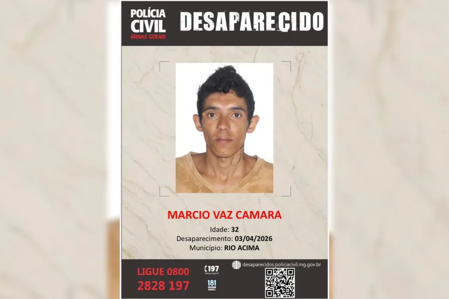 JORNAL SEMPRE – Marcio Vaz Camara, conhecido como Tata, de 32 anos, está desaparecido desde a tarde da última sexta-feira, dia 3, em Rio Acima. Ele foi visto pela última vez no bairro Cortesia.